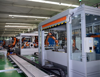 主要由机械手、激光打标机、缓存台、移行机、铣角机、压花机、滚筒线等设备、控制系统构成。该柔性加工线激光打标机采用先进的振镜系统和光纤激光器,与自动化对焦系统一起形成二维条形码,实行无人自动化打码。铣角机配置网络通讯接口,能够与上层生产线控制系统进行数据通信,实现全自动加工,即实现自动送料、自动装夹、自动倒角、自动出料。其主要流程为:铜排上线—冲孔剪切—自动打标—自动存储—自动铣角—自动压花—成品下线。大大减少了人员运用和手动操作,提高生产效率,降低生产成本,增加经济效益。